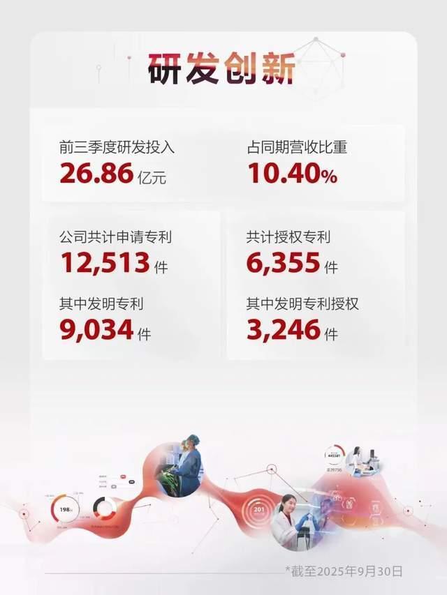 凭证三季报泄露,迈瑞医疗2025年前三季度陆续保持高研发过问,金额26.86亿元,占营业收入比重10.40%,占比同比提高。截止三季度末,公司累计肯求专利12513件,其中发明专利9034件;共计授权专利6355件,其中发明专利授权3246件,授权专利总额较上年同时增长792件。