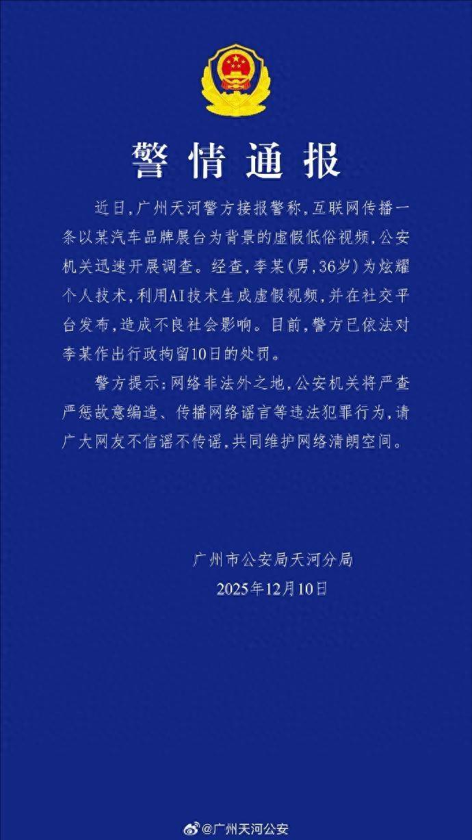 近日,广州河汉警方接报警称,互联网传播一条以某汽车品牌展台为布景的失实低俗视频,公安机关赶紧开展拜谒。经查,李某(男,36岁)为夸耀个东谈主时刻,运用AI时刻生成失实视频,并在酬酢平台发布,形成不良社会影响。当今,警方已照章对李某作出行政拘留10日的惩处。
