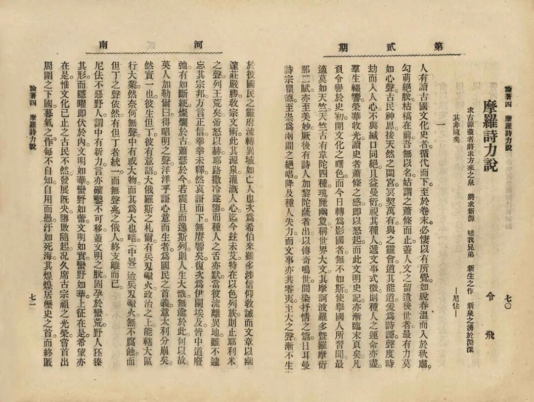 《摩罗诗力说》,《河南》杂志第二号和第三号刊载,令飞(鲁迅的一名)作,现藏上海藏书楼(开始:britishlibrary.cn)