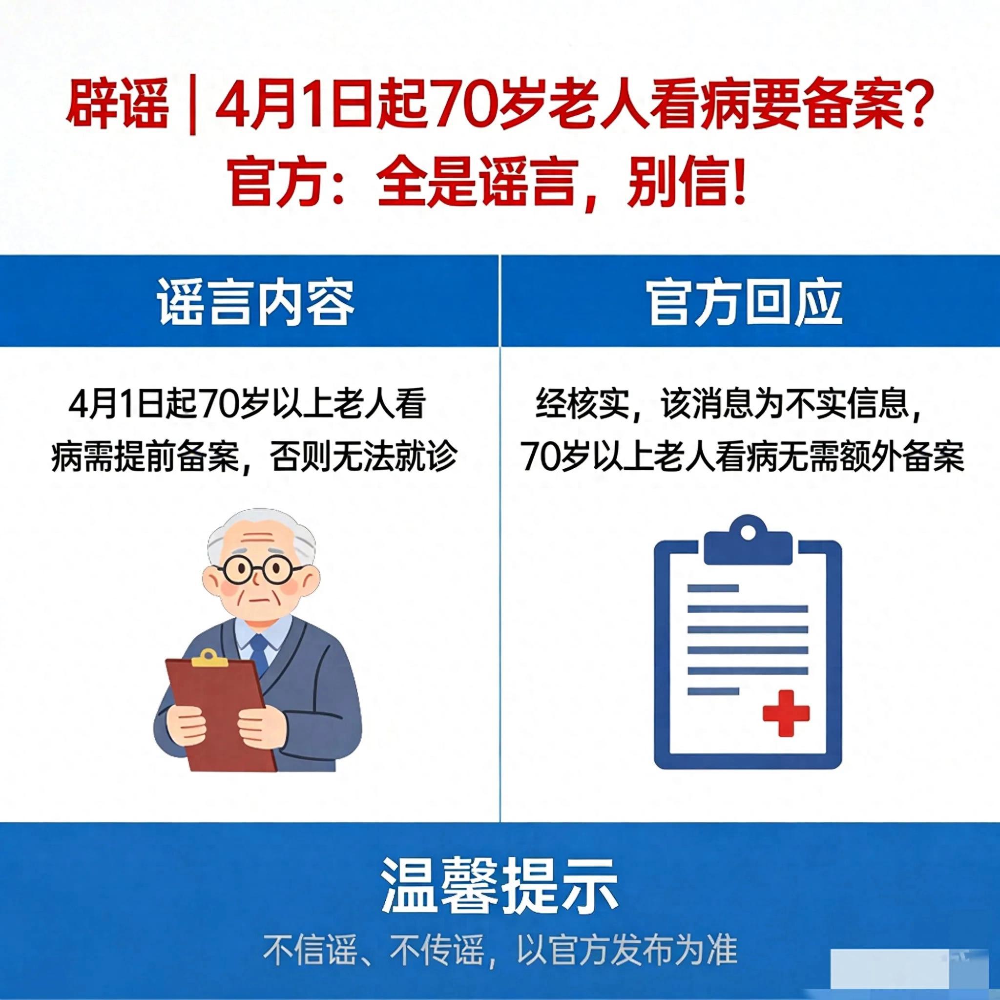 针对网传的“4月1日70岁以上老东谈主就医新规”,中国互联网搭伙辟谣平台、国度医保局、国度卫健委及各地医保部门,仍是一齐明确辟谣。