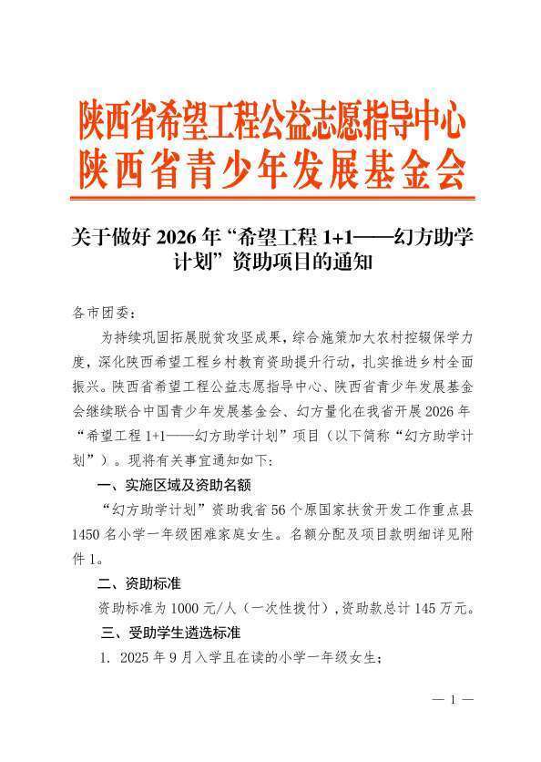 中国后生报客户端西安4月7日电(中青报·中青网记者 孙海华)2026年陕西但愿工程乡村讲明资助晋升活动暨“但愿工程1+1——幻方助学策划”即日驱动j9九游会,神色将面向全省56个沿途脱贫的原国度扶贫建立使命重心县(区、市),一次性资助1450名品学兼优、家庭经济不毛的小学一年事女生,资助总数145万元,每东说念主1000元,助力孩子们健康兴隆成长。记者从共青团陕西省委获悉,该神色执行4年来,已累计在该省资助小学低年事窘境家庭女生25336名,成为陕西但愿工程助力讲明平允、做事乡村振兴的标杆性公益神色。